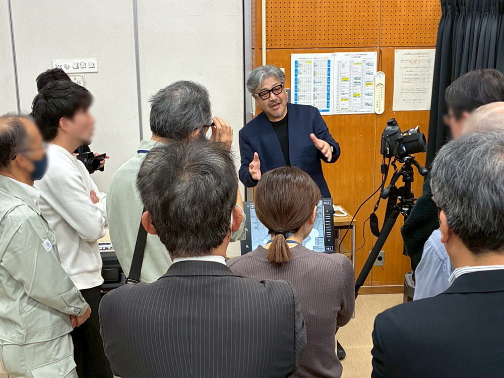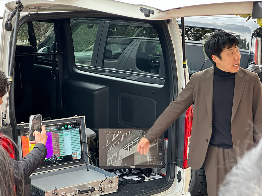 - 外壁撮影の実演:日照条件を考慮し、温度差が出やすい南面を中心にドローンによる赤外線撮影を実施し、参加者にリアルタイムで映像を確認していただきました 。