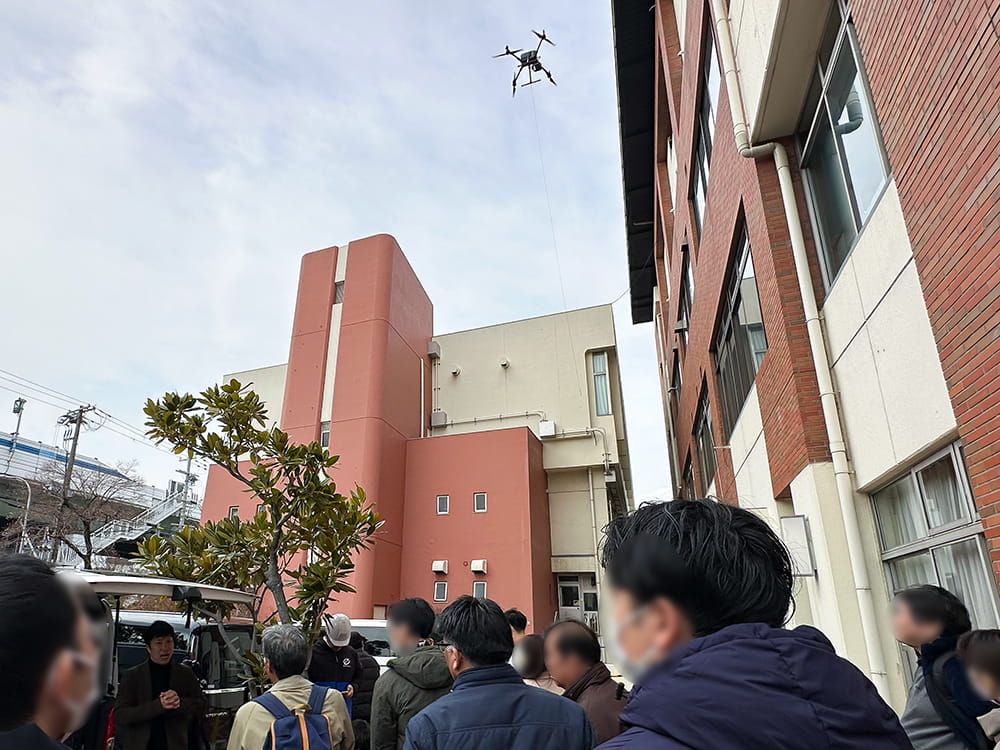 - 安全対策(係留措置)の実演:公共施設での運用において必須となる、屋上からの係留ロープ設置など、万が一の落下を防止する安全対策を実地で公開しました 。